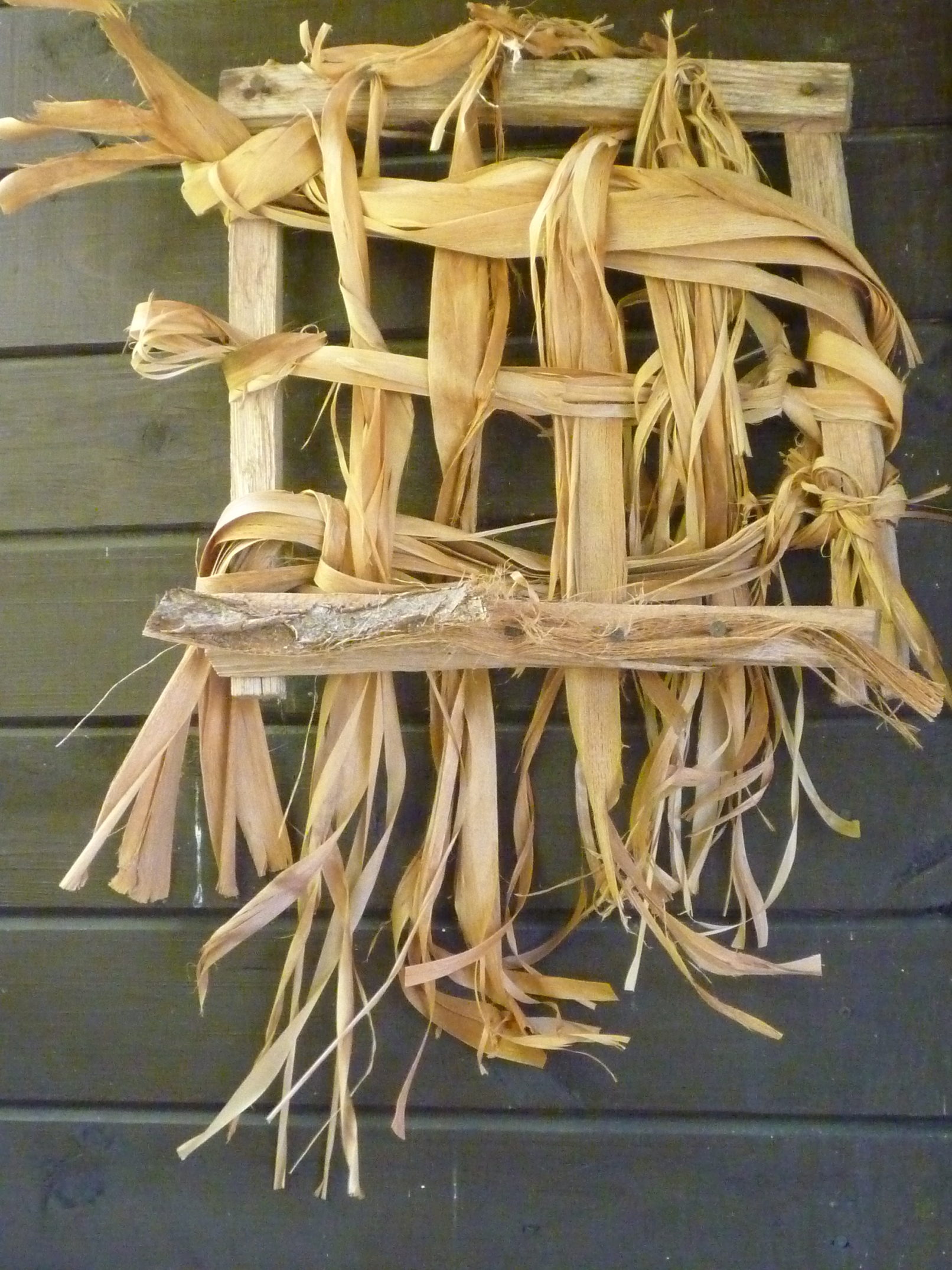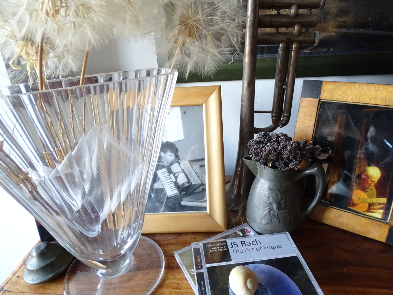 She steps down from the ladder, approaches the telephone, and remembers something. She takes the bunch of sticks from her bag and places them in a vase.