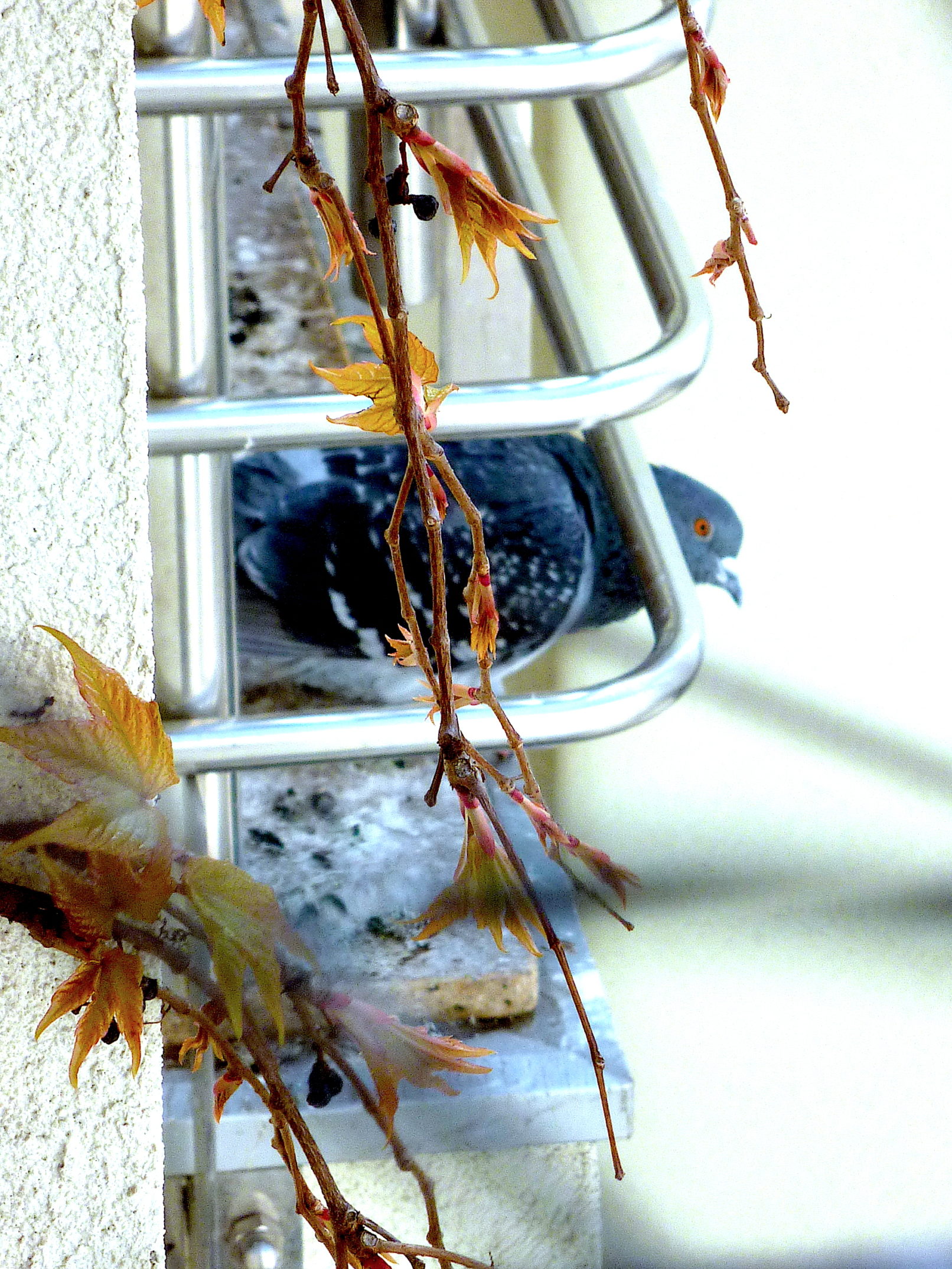 OLD LADY goes over to the balcony, opens the vent, crumbles bread on the floor. Pigeons enter the room. The doorbell rings.